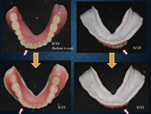 残っている歯が数本あって、それらを抜いて総入れ歯にする場合には治療用義歯に粘膜調整材という白い軟性の材料を使って理想的な形を追求していくことが多いです。この作業は結構奥が深くて、術者の経験やイメージに左右されます。どういう形がその患者さんにとって最も口の中で安定し快適なのか。無から有を作り出す総義歯医療はやりがいもある反面、困難なケースにも対応できるように常に勉強、準備が必要と思います。勉強と言っても本や単発の講習会参加だけでは私の場合には十分でないように思います。以前から参加し続けている咬合セミナー、勉強会のメンバーは1日中総義歯だけでお互いのケースを提示しながら活発な討論ができるので非常に助かっています。総義歯医療については、たとえ患者さんが満足したとしても、もっとこうすればよかったのではないか、もっとうまくなりたい、などという思いは尽きることがありません。