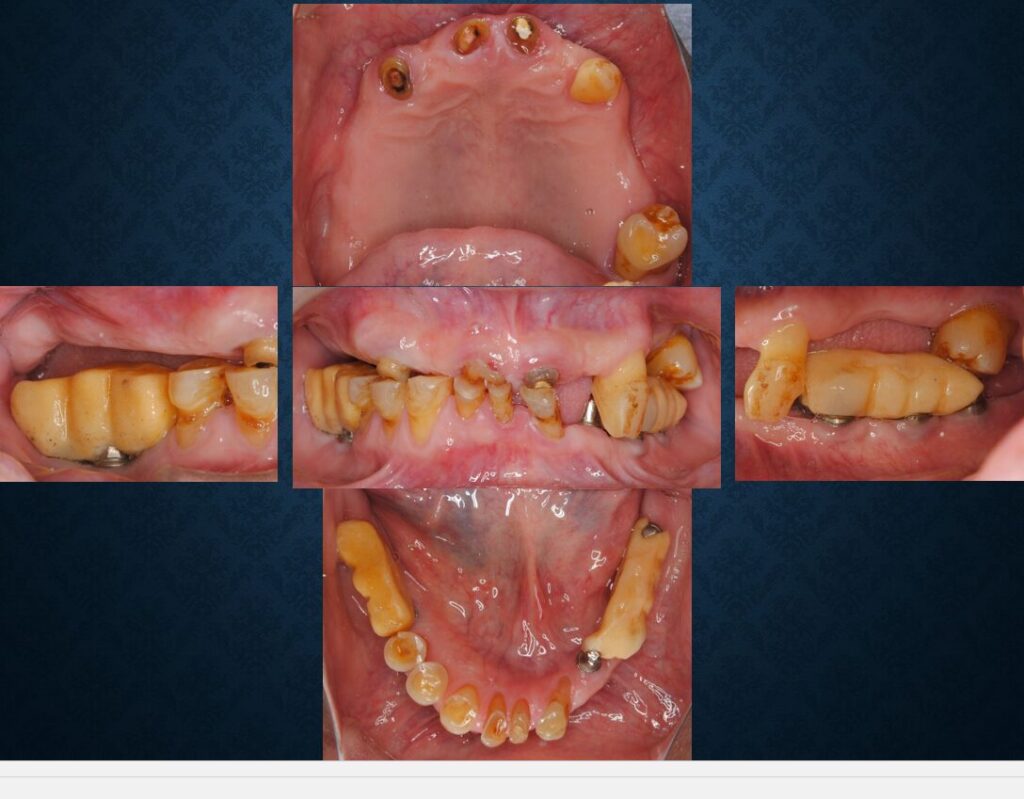 TさんはF銀行の方で60代男性でした。「他院でインプラントを入れたが乱暴なのでこちらで診て欲しい」「上もインプラントでやって欲しい」そのとの事で来院されました。お口の中はこんな状況でした。