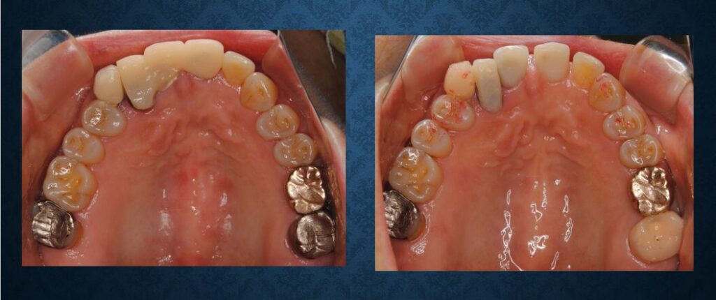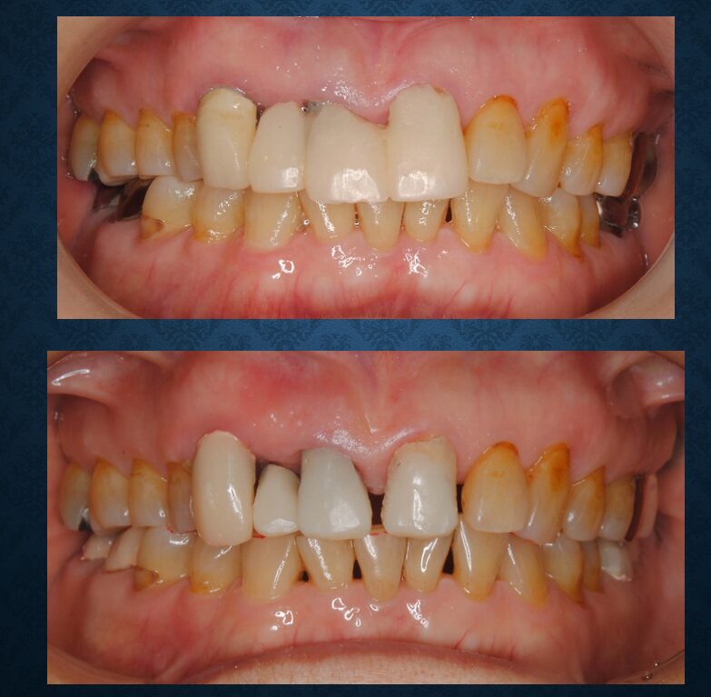 Kさんは80歳女性です。高額な補聴器をはじめ自分の体にはお金をかけたいとおっしゃっていました。数十年前に審美歯科と称して上の前歯の隙間を連結の被せ物で補綴されたそうですが、長年うちわみたいな歯で気になり続けていたとの事です。何とかならないかという事で矯正しか思いつかないと申し上げたところ、やって欲しいとの事でした。60歳代の方の矯正は何例か経験があったのですが、80歳代は私にとって初めてでした。初めに本来あった形態を想像して仮歯を装着し、矯正装置を先日装着しました。正月休みに入るのでその前にチェックしておきたかったので9日後に予約したところ、何とか違和感を受け入れていただけそうでした。歯も若干動き始めた事が確認できました。今後進展をいずれ報告できればと思います。